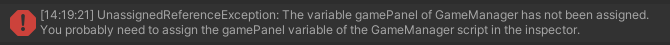 🔸'GameManager' 오브젝트의 스크립트 컴포넌트 중 'Clip' 변수에 할당 되어진 것이 없어서 발생한 오류이다.